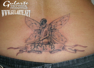 Un hada reposa pensativa sobre una cinta con las iniciales de sus tres hijos.